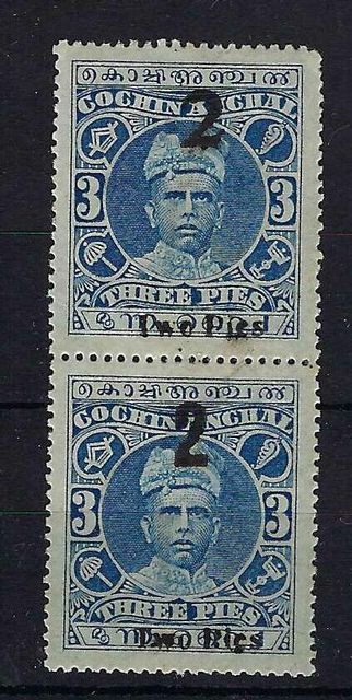 Indian Feudatory States ~ Cochin | 49/49b | 2 | 2p on 3p blue in a vertical pair showing BOTH TYPES OF SURCHARGE. A few light stains. | LMM | £125.00 | ||