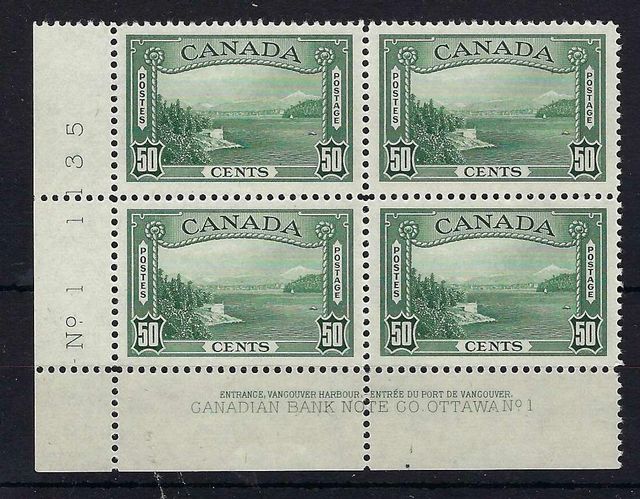 Canada | 366 | 4 | 50c green in a bottom left corner PLATE & IMPRINT block of 4. | UMM | £125.00 | ||