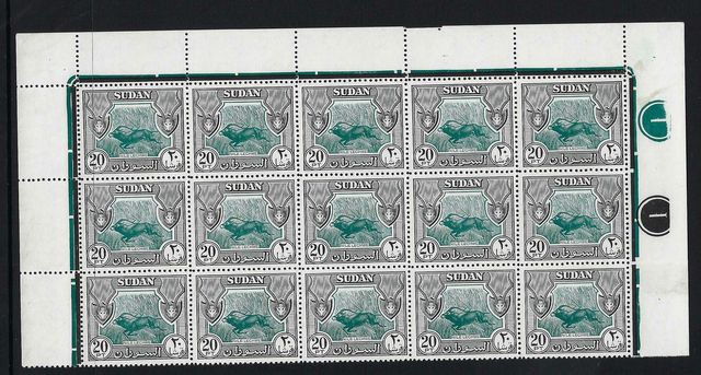 138 Sudan 20p blue green & black in a top right corner PLATE (1,1) block of 15 consisting of the top 3 rows of the sheet. - UMM