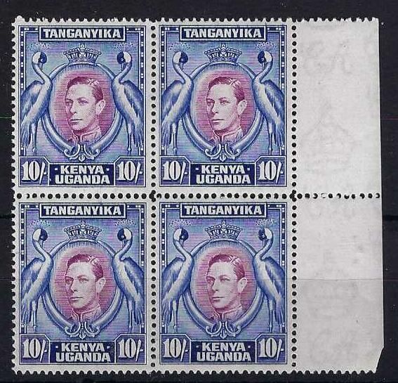 KUT-Kenya Uganda & Tanganyika | 149a | 4 | 10/- reddish purple & blue perf 14 in a right marginal block of 4. Reduced from £160.00 | UMM | £112.00 | ||