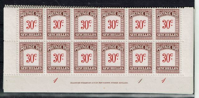 Seychelles | 139a | 6 | 15c brown carmine in a right marginal block of 6. | UMM | was £100.00 £75.00 | ||